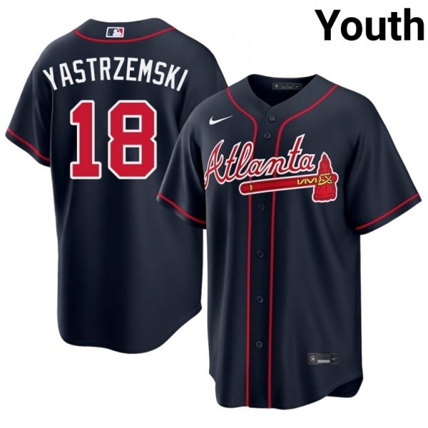 Represent the Braves' bullpen ace with this official Bravos Mike Yastrzemski Navy #18 Youth New Jersey. Designed for the dedicated fan, this jersey combines the classic look of Truist Park with modern comfort technology, making it perfect for game days, tailgates, or casual wear.